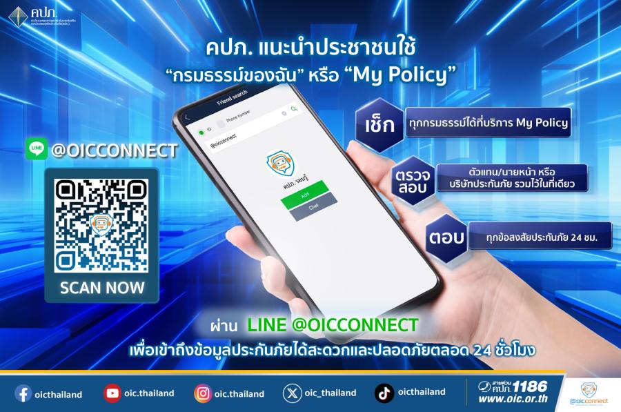 คปภ. แนะนำประชาชนใช้บริการ “กรมธรรม์ของฉัน” หรือ “My Policy” ผ่าน LINE @OICConnect เพื่อเข้าถึงข้อมูลประกันภัย