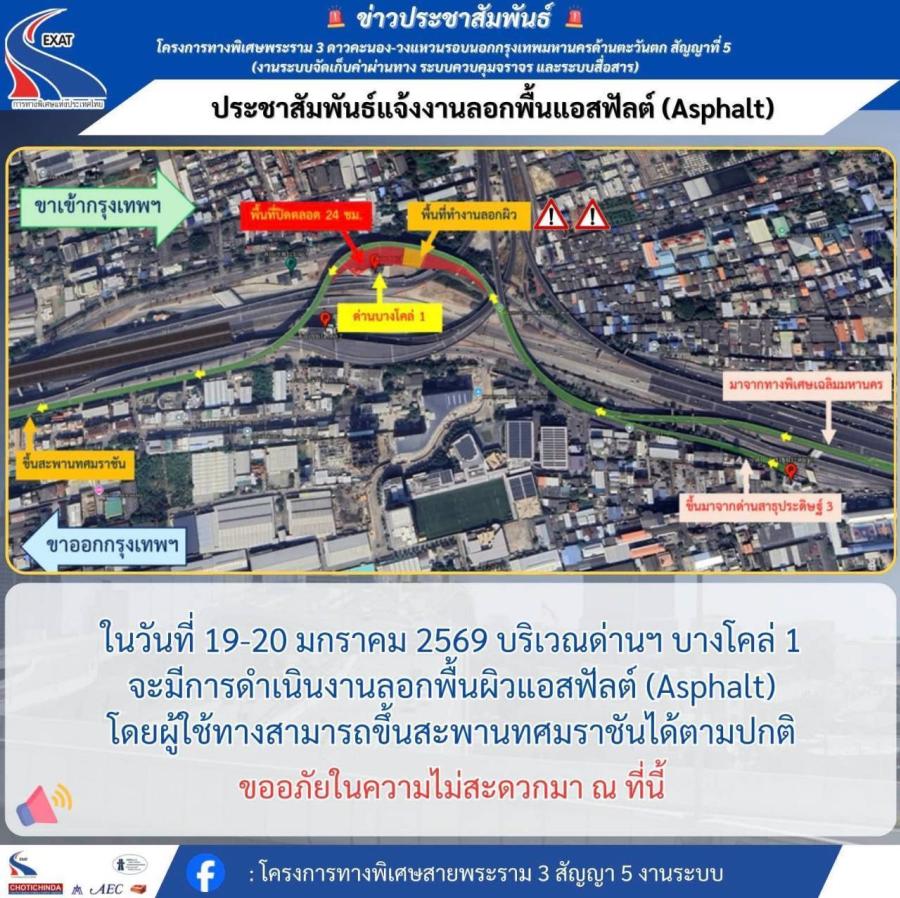 กทพ. แจ้งงานลอกผิวถนนแอสฟัลต์ ด่านฯ บางโคล่ 1–2 ทางพิเศษเฉลิมมหานคร เพื่อเตรียมปรับปรุงและปูผิวทางใหม่