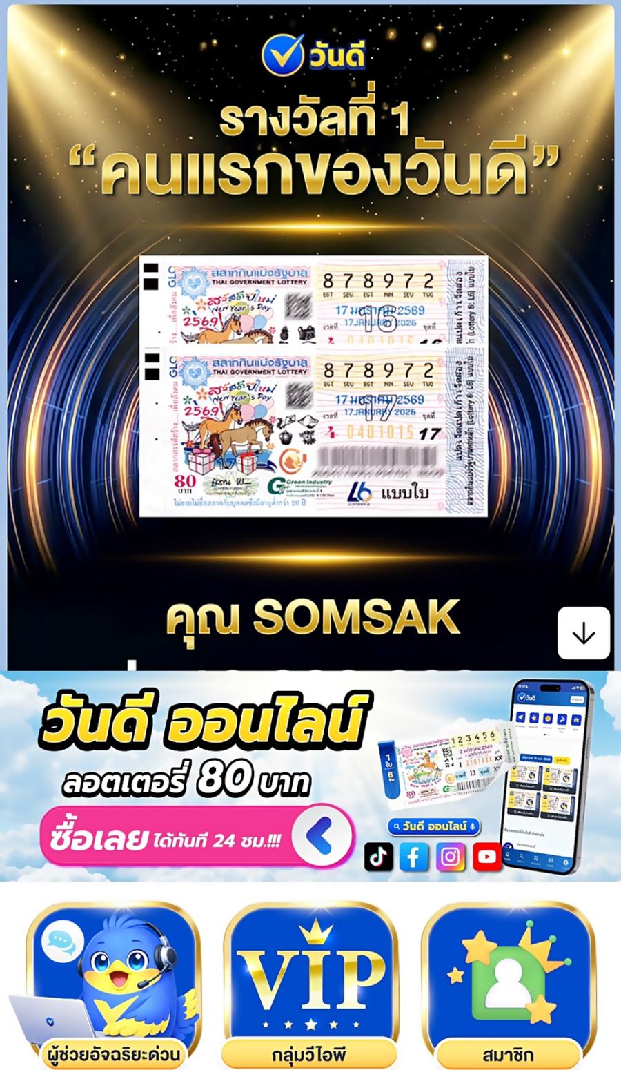 เบิกฤกษ์ดีต้อนรับเดือนแรกของปี “วันดี ออนไลน์”มอบโชคให้ลูกค้า ถูกรางวัลที่ 1 สองใบ รับเงิน 12 ล้าน
