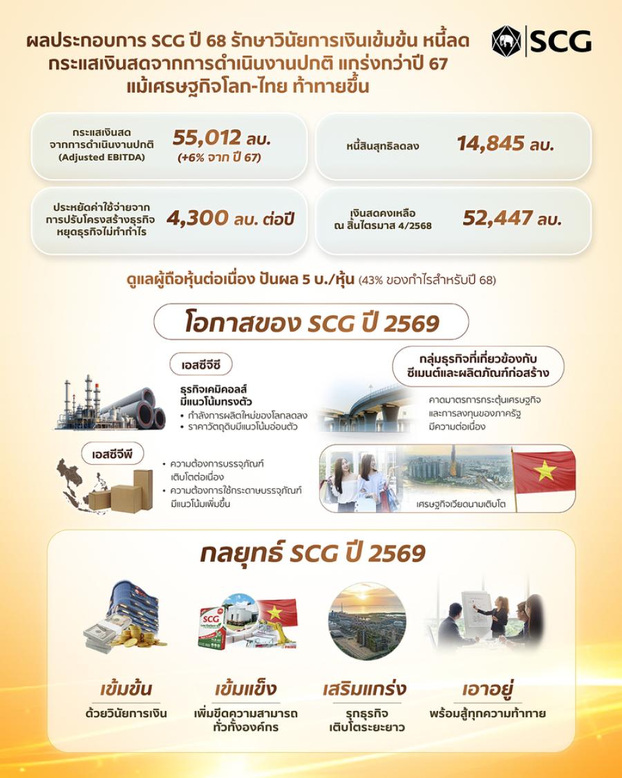 ผลประกอบการเอสซีจีปี 68 กระแสเงินสดจากการดำเนินงานปกติ 5.5 หมื่นล้านบาท แกร่งกว่าปี 67 แม้เศรษฐกิจโลก-ไทย ท้าทายขึ้น เคาะปันผล 5 บาท/หุ้น ดูแลผู้ถือหุ้นต่อเนื่อง ชี้ปี 69 เดินหน้า “เข้มข้น – เข้มแข็ง – เสริมแกร่ง – เอาอยู่” พร้อมสู้ทุกความท้าทาย