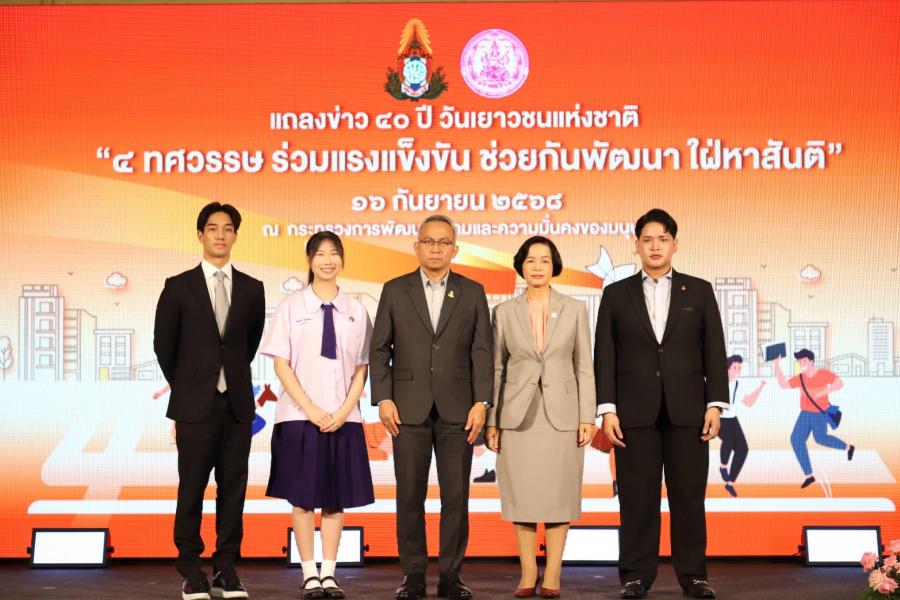 วันอังคารที่ 16 กันยายน 2568 เวลา 09.00 น. นายอนุกูล ปีดแก้ว ปลัดกระทรวงการพัฒนาสังคมและความมั่นคงของมนุษย์ (ปลัด พม.) เป็นประธานแถลงข่าว 40 ปี วันเยาวชนแห่งชาติ เนื่องในวันเยาวชนแห่งชาติ ประจำปี 2568 ภายใต้แนวคิด “4 ทศวรรษ ร่วมแรงแข็งขัน ช่วยกัน พัฒนา ใฝ่หาสันติ” เพื่อส่งเสริมศักยภาพเด็กและเยาวชนทั่วประเทศ