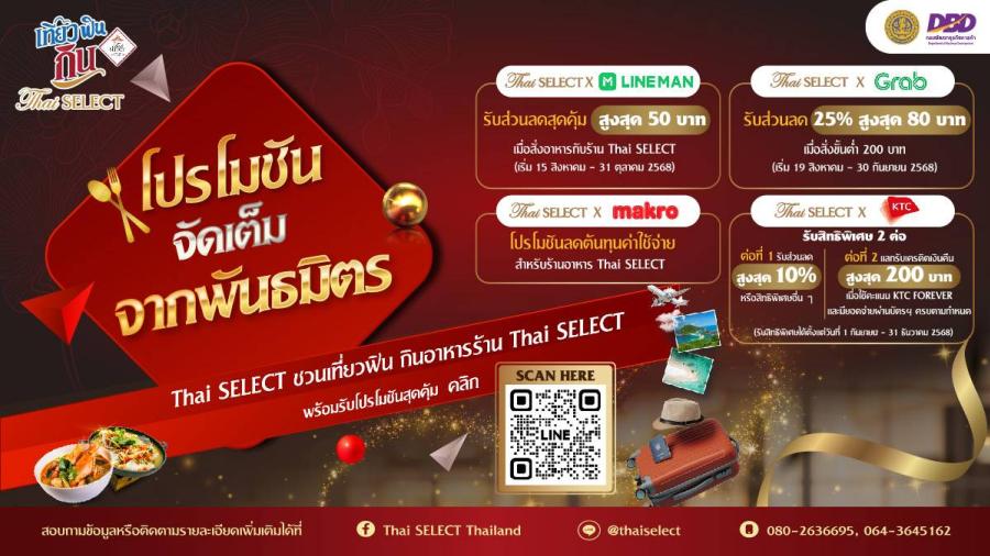 กรมพัฒนาธุรกิจการค้า กระทรวงพาณิชย์ เร่งเครื่องลุยโค้งสุดท้ายแคมเปญ ‘เที่ยว ฟิน กิน Thai SELECT ปี 2’ อย่างต่อเนื่อง จับมือพันธมิตรชั้นนำมอบสิทธิพิเศษแก่ผู้บริโภคและร้านอาหาร Thai SELECT ทั่วประเทศ พร้อมเชิญชวนร่วมกิจกรรม ‘กินดีมีเฮง’ ลิ้มรสความอร่อยจากร้าน Thai SELECT ลุ้นรางวัลใหญ่รวมมูลค่ากว่า 600000 บาท อีกทั้งเอาใจสายครีเอเตอร์ กับการประกวดคลิปวิดีโอสั้น ‘อาหารไทย ต้อง Thai SELECT’ ชิงเงินรางวัลและโล่เกียรติยศ มูลค่ารวมกว่า 300000 บาท หมดเขตร่วมกิจกรรม 15 ตุลาคม 2568