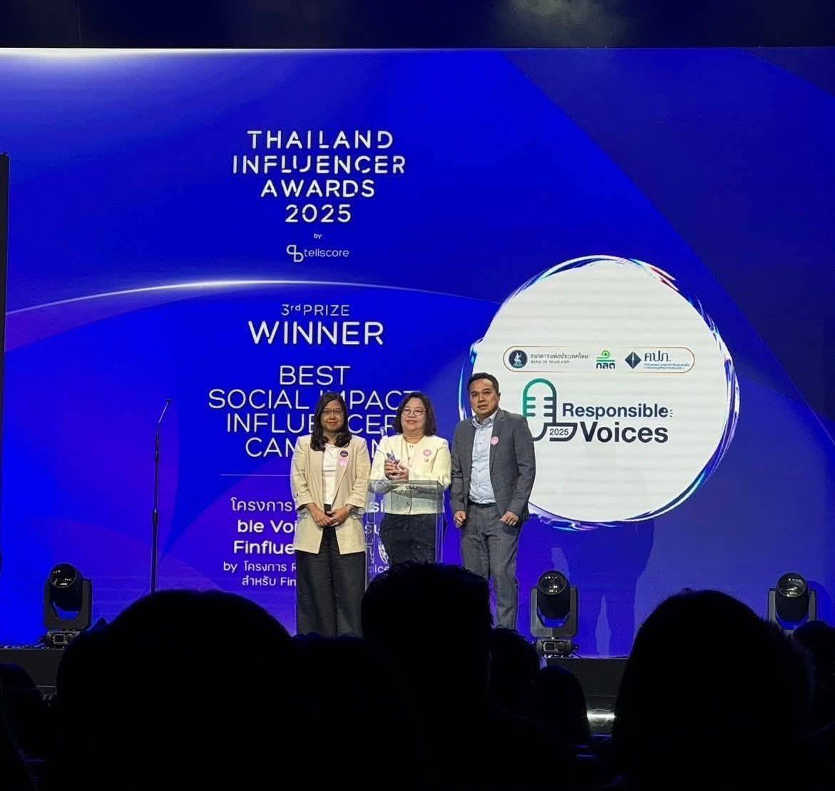ในโอกาสนี้ ผู้แทนจากทั้ง 3 หน่วยงาน ได้ขึ้นเวทีรับรางวัลเชิดชูเกียรติจากโครงการ Responsible Voices ซึ่งเป็นการยกย่องบทบาทขององค์กรที่ให้การสนับสนุนและร่วมขับเคลื่อนแนวคิด “Responsible Voices” อย่างต่อเนื่อง เพื่อส่งเสริมการสื่อสารทางการเงินและการประกันภัยอย่างมีความรับผิดชอบ โปร่งใส และเป็นประโยชน์ต่อสังคม รางวัลดังกล่าวสะท้อนถึงความมุ่งมั่นของทั้ง 3 หน่วยงานกำกับภาคการเงิน ในการร่วมกันสร้างระบบนิเวศการสื่อสารทางการเงินที่มีจริยธรรม และเป็นพลังในการยกระดับมาตรฐานคอนเทนต์เชิงคุณภาพของประเทศอย่างยั่งยืน