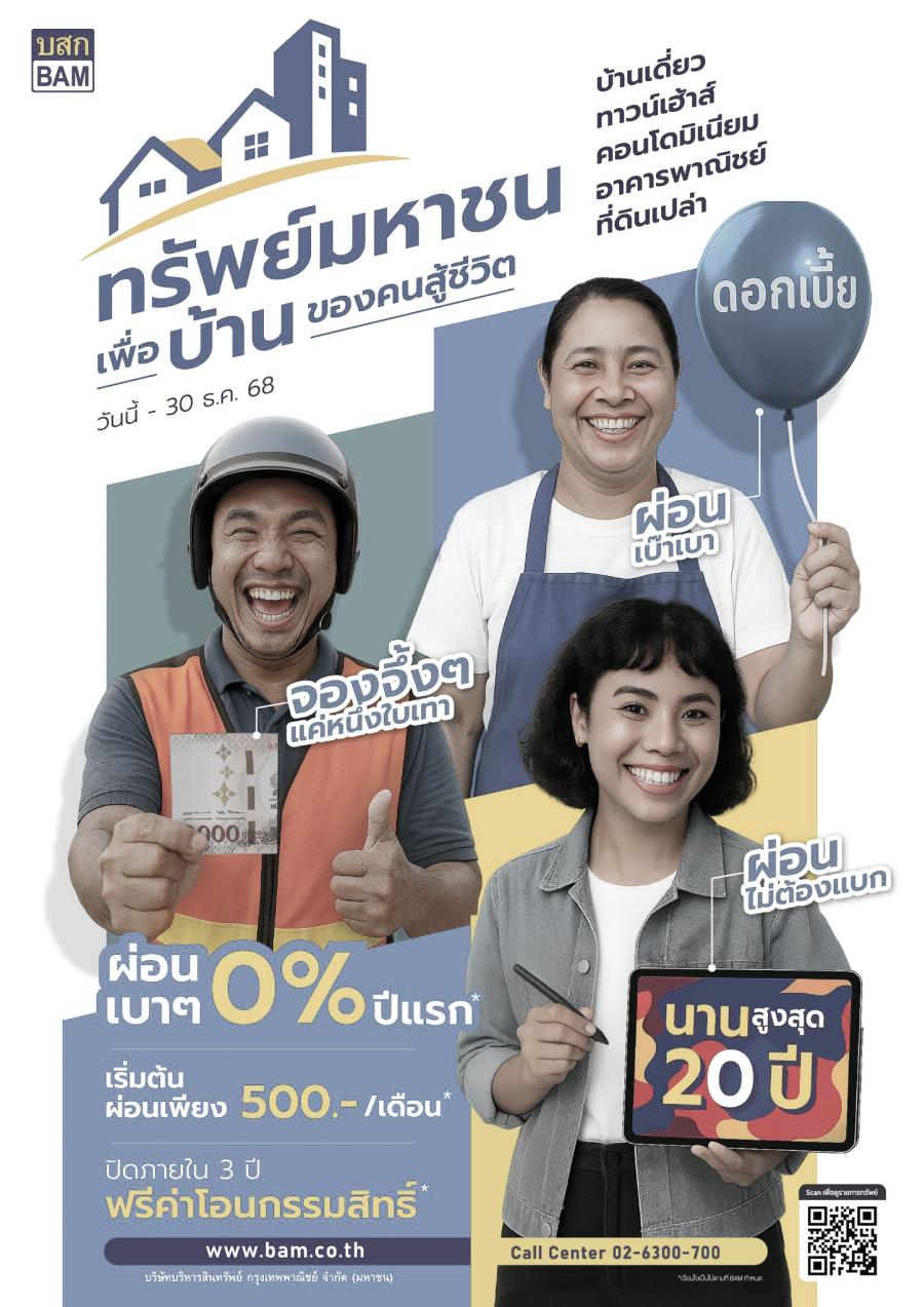 โดย BAM ได้คัดเลือกทรัพย์สินราคาไม่เกิน 3 ล้านบาททั่วประเทศ มาให้กลุ่มคนอยากมีบ้านได้เลือกซื้อทั้งบ้าน ที่ดิน คอนโด อาคารพาณิชย์ ถ้าซื้อเงินสด BAM มีพันธมิตรสถาบันการเงินพร้อมพิจารณาปล่อยสินเชื่อ ถ้าต้องการผ่อนตรงกับ BAM มีโปรจูงใจ “ค่าจองจึ้ง ๆ แค่หนึ่งใบเทา ดอกเบี้ยเบ๊า เบา 0% ปีแรก ผ่อนแบบไม่ต้องแบก เริ่ม 500 บาทต่อเดือนเท่านั้น”