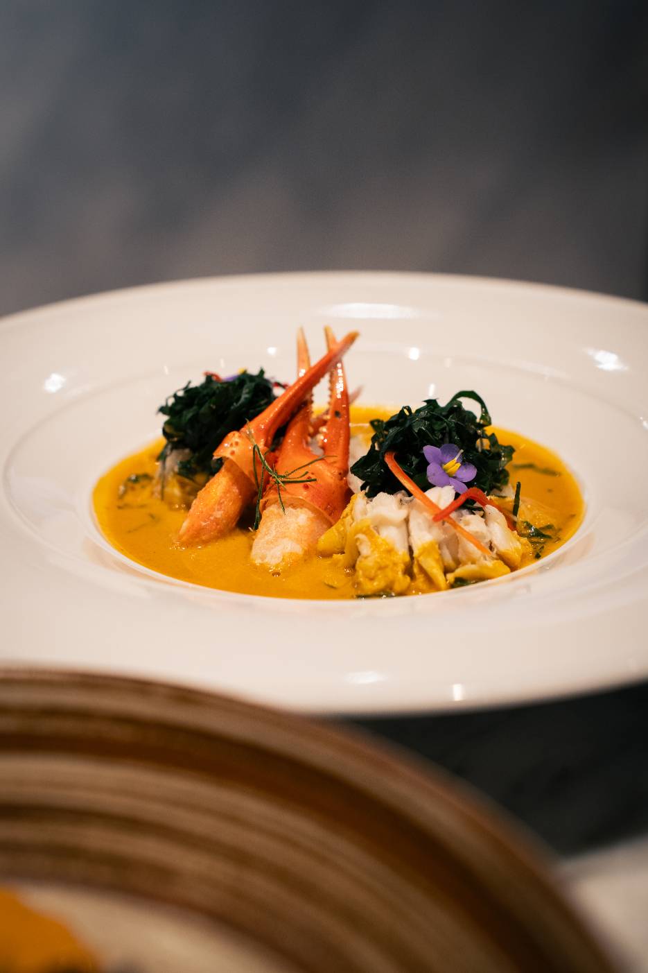 “Chapter II – The Dialogue of Masters” ซึ่งเป็นหัวใจของค่ำคืนแห่งนี้ เชฟมานะชัย ถ่ายทอดความผูกพันระหว่างศิษย์และอาจารย์ผ่านเมนู Southern Thai Blue Crab Curry เพื่ออุทิศแด่ อาจารย์ศรีสมร คงพันธุ์ ผู้เป็นแรงบันดาลใจในการทำครัวของเขา ถ่ายทอดรสชาติจัดจ้านละเมียดละไมของภาคใต้ ผ่านเนื้อปูม้าสดใหม่ เคี่ยวกับเครื่องแกงตำมือและกะทิคั้นสดจนได้รสกลมกล่อม จากนั้น มาสเตอร์เชฟนูรอ ถ่ายทอดมรดกทางอาหารไทยชั้นสูงในเมนู Klong Phai Free-Range Chicken Curry with Rice Noodles & Southern Braised Beef Cheek in Green Curry Paste ที่นำความหอมมันของแกงเขียวหวานมาผสานความเปรี้ยวหวานของสับปะรดภูเก็ต และความนุ่มละลายของแก้มวัวตุ๋น จนได้รสชาติแห่งความสมดุลและงดงามดั่งบทกวี ปิดท้ายบทสนทนาแห่งรสชาติด้วย Sea Bass with “Whisper of Love”