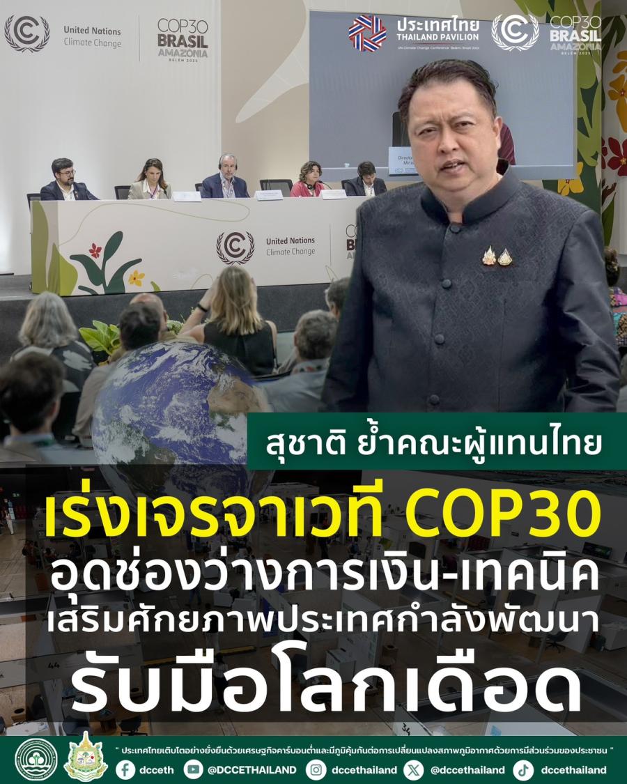 วันที่ 13 พฤศจิกายน 2568 นายสุชาติ ชมกลิ่น รองนายกรัฐมนตรี และรัฐมนตรีว่าการกระทรวงทรัพยากรธรรมชาติและสิ่งแวดล้อม เปิดเผยว่า การประชุมรัฐภาคีกรอบอนุสัญญาสหประชาชาติว่าด้วยการเปลี่ยนแปลงสภาพภูมิอากาศ สมัยที่ 30 (COP 30) และการประชุมอื่นที่เกี่ยวข้อง ที่จัดขึ้น ณ เมืองเบเล็ง สหพันธ์สาธารณรัฐบราซิล ได้ผ่านมาเป็นวันที่ 3 ซึ่งคณะผู้แทนไทยโดยกรมการเปลี่ยนแปลงสภาพภูมิอากาศและสิ่งแวดล้อม ในฐานะหน่วยประสานงานกลางของประเทศภายใต้กรอบอนุสัญญาฯ พร้อมทั้งผู้แทนจากหน่วยงานที่เกี่ยวข้อง เข้าร่วมเจรจาอย่างต่อเนื่อง โดยมีความก้าวหน้าสำคัญด้านการปรับตัวต่อการเปลี่ยนแปลงสภาพภูมิอากาศ ดังนี้