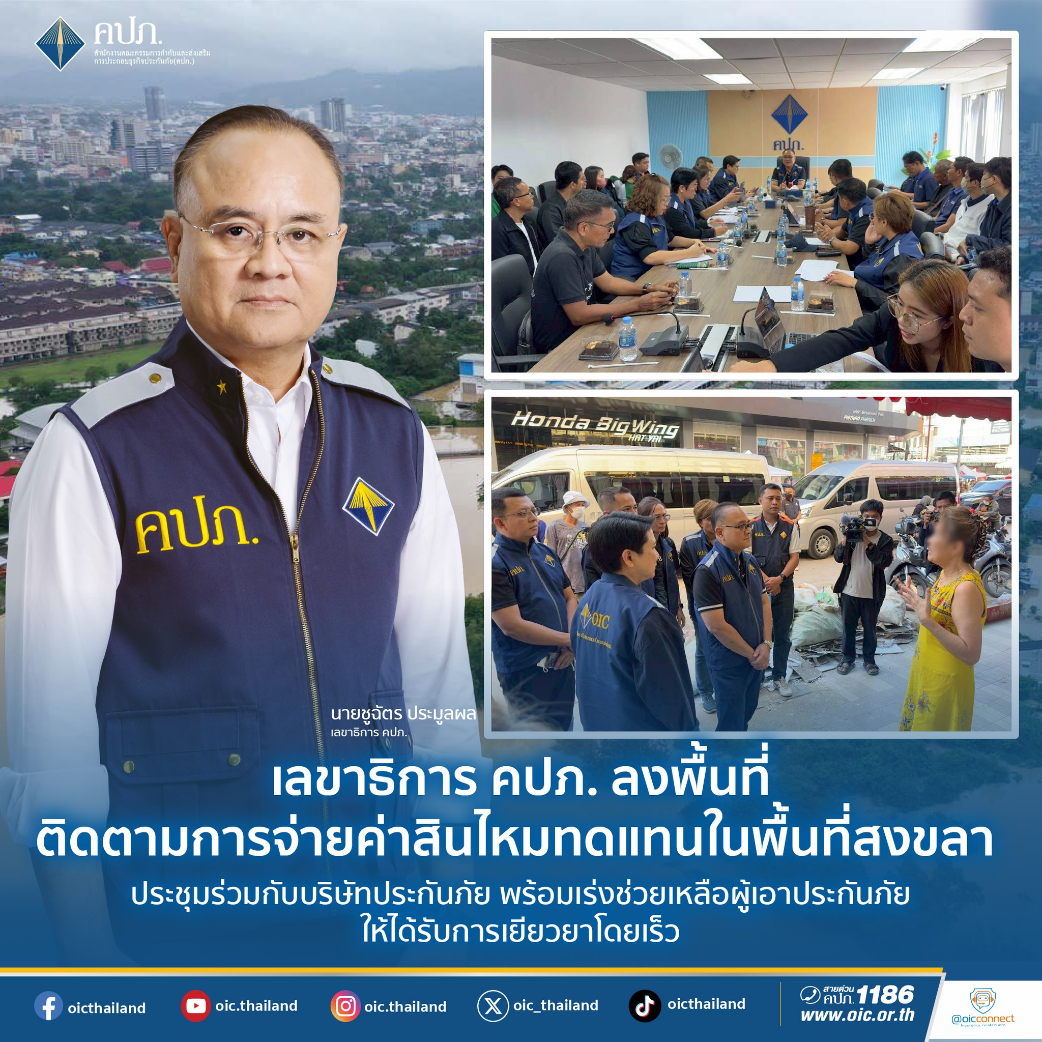 เมื่อวันที่ 7 ธันวาคม 2568 สำนักงานคณะกรรมการกำกับและส่งเสริมการประกอบธุรกิจประกันภัย (สำนักงาน คปภ.) โดย นายชูฉัตร ประมูลผล เลขาธิการ คปภ. พร้อมด้วย นางสาววสุมดี วสีนนท์ รองเลขาธิการ ด้านกำกับคนกลาง และประกันภัยภูมิภาค และคณะ ได้ลงพื้นที่จังหวัดสงขลาเพื่อประชุมร่วมกับผู้แทนบริษัทประกันภัย โดยได้ติดตามสถานการณ์อุทกภัยและกำหนดมาตรการเร่งด่วนในการช่วยเหลือผู้เอาประกันภัย หลังหลายพื้นที่ได้รับผลกระทบรุนแรงส่งผลกระทบต่อชีวิต ทรัพย์สิน และการประกอบกิจการของประชาชนจำนวนมาก