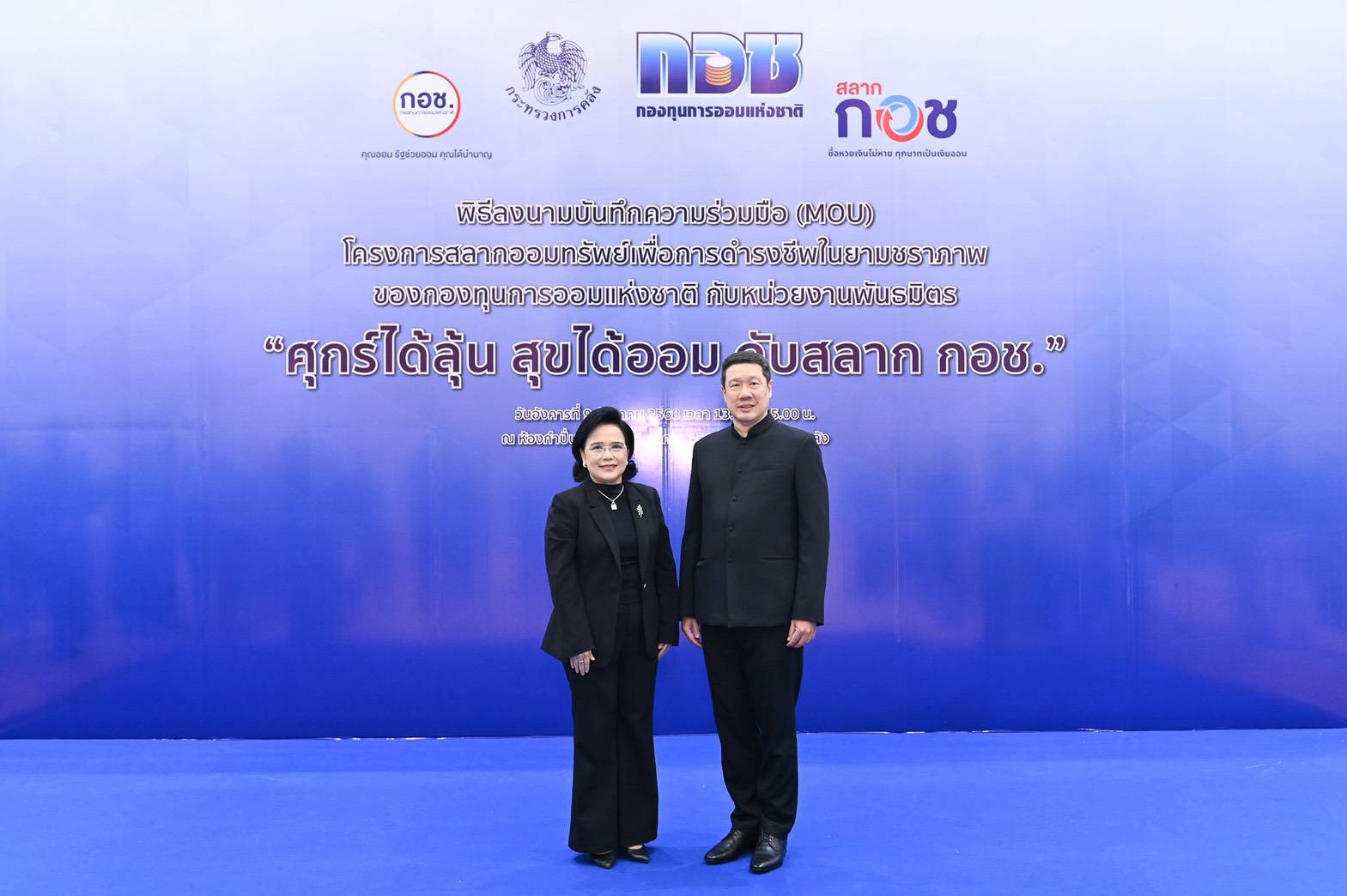 กองทุนการออมแห่งชาติ (กอช.) จัดงานแถลงข่าวบันทึก ความร่วมมือ (MOU)โครงการสลากออมทรัพย์เพื่อการดำรงชีพในยามชราภาพของกองทุนการออมแห่งชาติ กับหน่วยงานพันธมิตร “ศุกร์ได้ลุ้น สุขได้ออม กับสลาก กอช.” เพื่อยกระดับ การออม ของคนไทยเข้าสู่การออมผ่านดิจิทัล ที่สะดวก รวดเร็ว ครอบคลุมทุกช่องทาง ทุกพื้นที่ พร้อมลุ้นรางวัล ใหญ่ 1 ล้านบาททุกสัปดาห์ ณ ห้องกำปั่นทอง ชั้น 21 อาคาร 150 ปี กระทรวงการคลัง