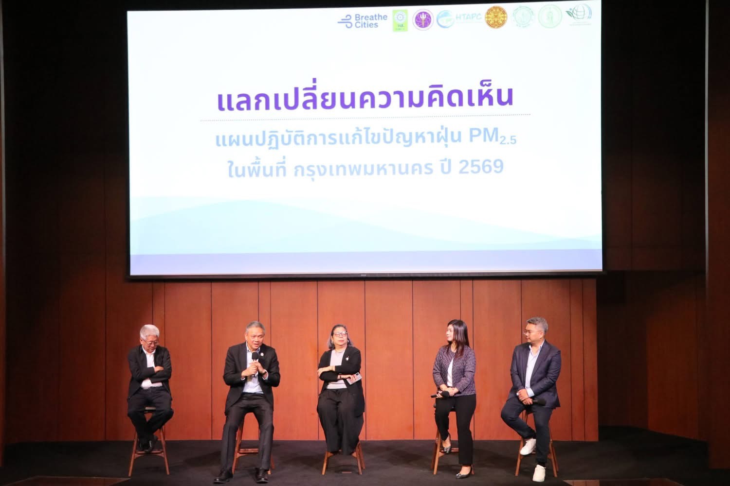 ช่วงท้ายของการประชุมเป็นเวทีแลกเปลี่ยนความคิดเห็นและข้อเสนอแนะต่อแผนปฏิบัติการแก้ไขปัญหาฝุ่น PM2.5 ในพื้นที่กรุงเทพมหานคร ปี 2569 โดย ดร.สุพัฒน์ หวังวงศ์วัฒนา ผู้อำนวยการศูนย์รวมผู้เชี่ยวชาญด้านมลพิษอากาศและภูมิอากาศ รองศาสตราจารย์ ดร.สาวิตรี การีเวทย์ มหาวิทยาลัยเทคโนโลยีพระจอมเกล้าธนบุรี รองศาสตราจารย์ ดร.สุรัตน์ บัวเลิศ รองศาสตราจารย์ ดร.ภาคภูมิ ชูมณี และผู้ช่วยศาสตราจารย์ ดร.ธัญภัสสร์ ทองเย็น คณะสิ่งแวดล้อม มหาวิทยาลัยเกษตรศาสตร์ ร่วมให้ข้อคิดเห็นและตอบข้อซักถาม พร้อมด้วย ดร.วีระศักดิ์ โควสุรัตน์ ประธานสภาลมหายใจกรุงเทพ และ ดร.เจน ชาญณรงค์ รองประธานสภาลมหายใจกรุงเทพ ในฐานะสภาลมหายใจกรุงเทพภาคประชาชน ร่วมให้ข้อคิดเห็นในครั้งนี้ และเปิดโอกาสให้หน่วยงานภาครัฐ นักวิชาการ และผู้มีส่วนเกี่ยวข้องร่วมสะท้อนมุมมอง เพื่อใช้เป็นข้อมูลประกอบการพัฒนาแผนให้สอดคล้องกับบริบทของกรุงเทพมหานคร และสามารถนำไปสู่การปฏิบัติได้จริง