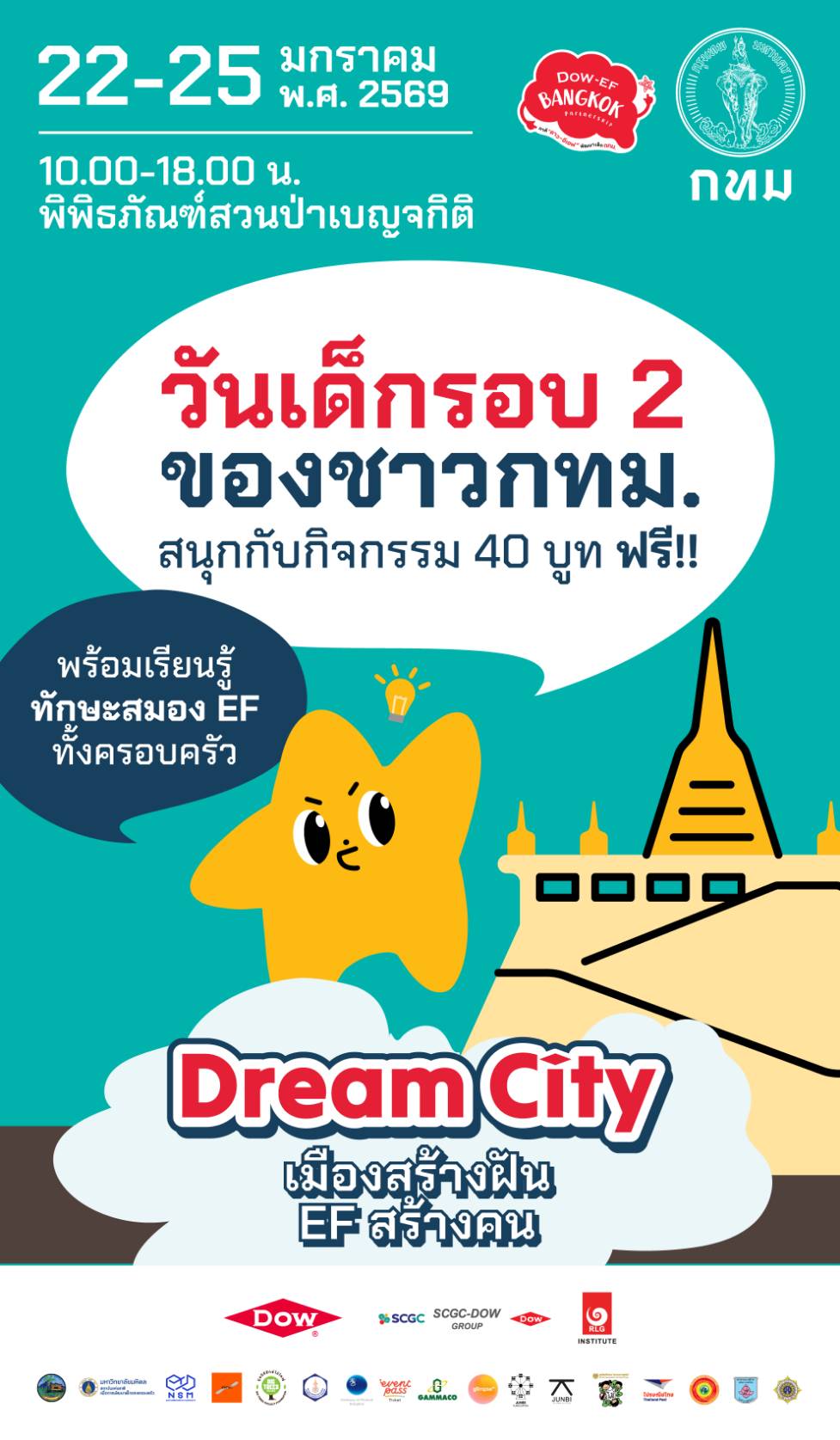 กรุงเทพฯ – 12 มกราคม 2569 – ข่าวดีสำหรับผู้ปกครอง คุณครู และน้องๆ ชาวกทม. กับควันหลงวันเด็กในปีนี้ ฟรี! ร่วมสนุกได้กว่า 40 ซุ้มกิจกรรมขนาดใหญ่ พร้อมเวทีการแสดงและแบ่งปันความรู้ด้านการพัฒนาทักษะสมอง EF หรือ Executive Function ในเด็ก ซึ่งเป็นสมองส่วนที่ควบคุมการคิดวิเคราะห์ การควบคุมอารมณ์ และการกำกับตนเอง พบกันวันที่ 22–25 มกราคม 2569 ณ พิพิธภัณฑ์สวนป่าเบญจกิติ (โรงงานยาสูบ) กรุงเทพมหานคร เวลา 10:00-18:00 น. กับมหกรรมพัฒนาทักษะสมองเพื่อเด็กดี เก่ง สุข สมวัย “ดรีมซิตี้: เมืองสร้างฝัน อีเอฟสร้างคน” ติดตามรายละเอียดได้ที่เฟซบุ๊ก Dow Thailand Group