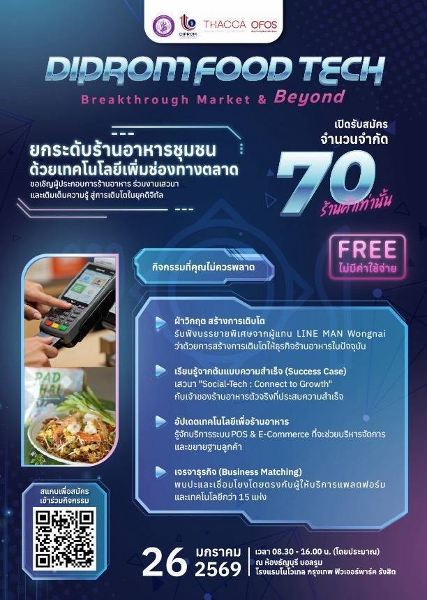 กรมส่งเสริมอุตสาหกรรม (DIPROM) เชิญชวนธุรกิจร้านอาหารสมัครเข้าร่วมงาน DIPROM Food Tech: Breakthrough Market & Beyond ในวันที่ 26 มกราคมนี้ เวลา 8.30 – 16.00 น. โรงแรมโนโวเทลกรุงเทพ ฟิวเจอร์พาร์ครังสิต ฟรี ไม่ค่าใช้จ่าย รีบสมัครด่วน รับจำนวนจำกัดเพียง 70 ร้านค้าเท่านั้น เพื่อโอกาสคว้าความสำเร็จที่ใกล้แค่เอื้อม โดยเฉพาะโอกาสที่จะได้เจรจาธุรกิจกับผู้ให้บริการแพลตฟอร์มและเทคโนโลยีกว่า 15 แห่งในงานนี้