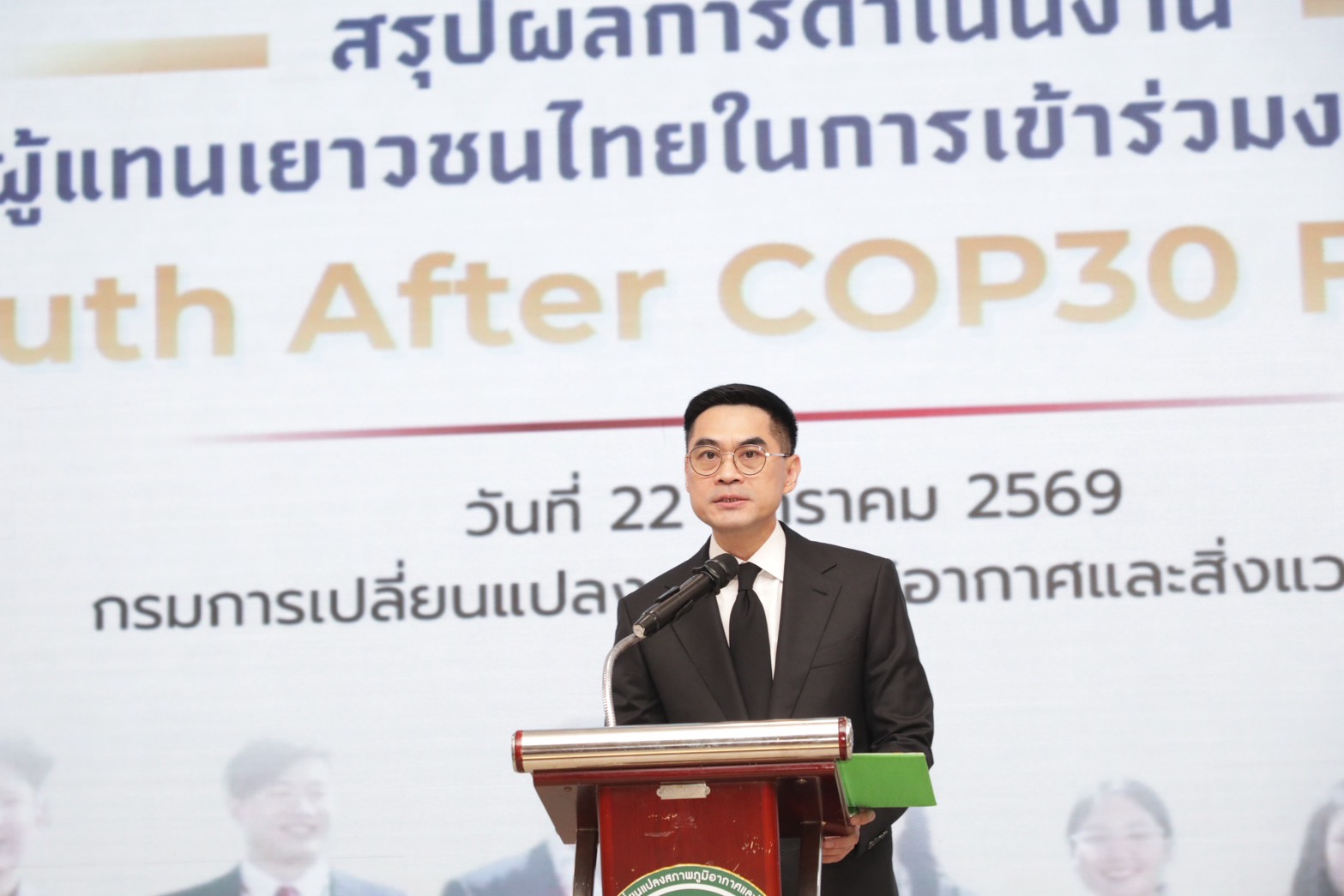 วันที่ 22 มกราคม 2568 กรมการเปลี่ยนแปลงสภาพภูมิอากาศและสิ่งแวดล้อม กระทรวงทรัพยากรธรรมชาติและสิ่งแวดล้อม จัดงานสรุปผลการดำเนินงานของผู้แทนเยาวชนไทยในการเข้าร่วมงาน COP30 หรือ Youth After COP30 Forum สะท้อนมุมมองเยาวชนไทยในการขับเคลื่อนการดำเนินงานด้านการเปลี่ยนแปลงสภาพภูมิอากาศ