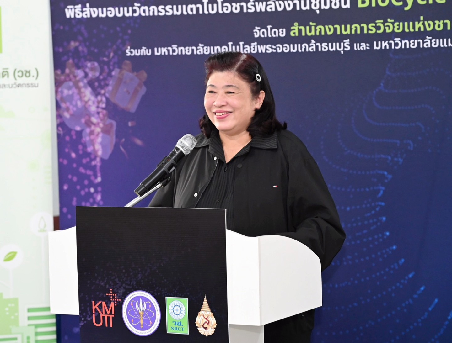 ดร.วิภารัตน์ ดีอ่อง ผู้อำนวยการสำนักงานการวิจัยแห่งชาติ กล่าวว่า อว.ได้จัดทำโครงการของขวัญปีใหม่ 2569 ซึ่ง วช.ได้ร่วมมอบนวัตกรรมเพื่อการใช้ประโยชน์ให้กับพื้นที่ ผ่านนวัตกรรมเตาไบโอชาร์พลังงานชุมชน BioCycle Kiln โดยสนับสนุนให้มหาวิทยาลัยเทคโนโลยีพระจอมเกล้าธนบุรีร่วมกับมหาวิทยาลัยแม่ฟ้าหลวง ร่วมพัฒนานวัตกรรมดังกล่าว ควบคู่ไปกับการถ่ายทอดองค์ความรู้ด้านการใช้งานสู่ชุมชน